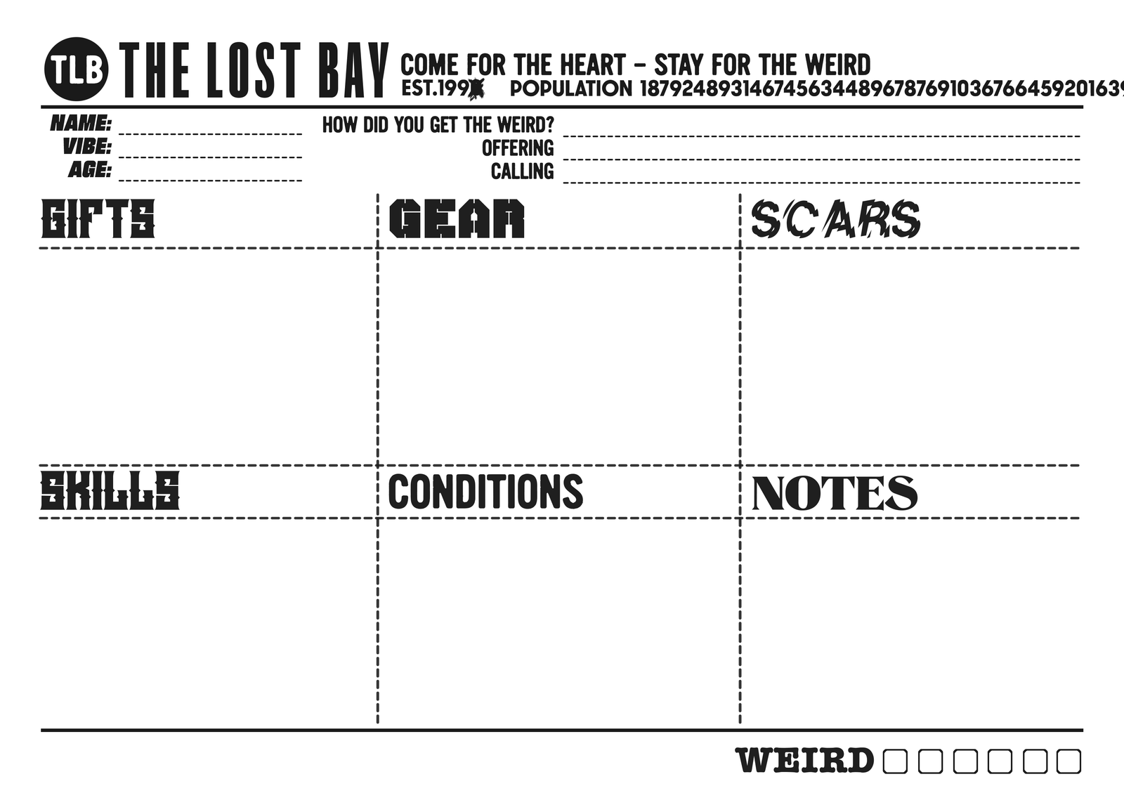 Character Sheets Character Sheet 1 Clean Character Sheet 1 Dirty =========== Character Sheet 2 Clean Character Sheet 2 Dirty =========== Art and layout by Scragend.