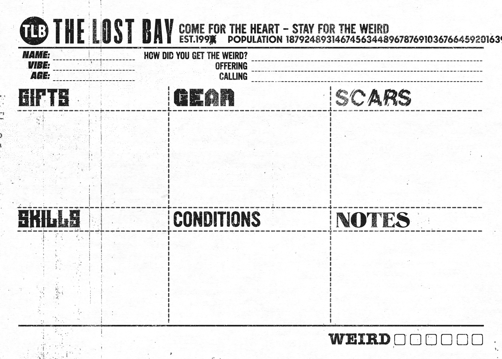 Character Sheets Character Sheet 1 Clean Character Sheet 1 Dirty =========== Character Sheet 2 Clean Character Sheet 2 Dirty =========== Art and layout by Scragend.